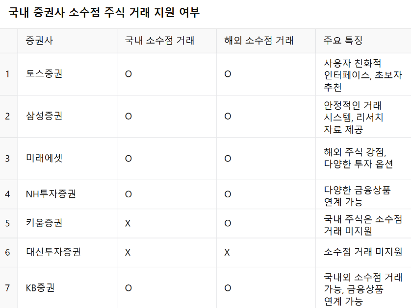 소수점 주식을 지원하는 증권사로는 토스증권, 삼성증권, 미래에셋 등이 있다. 아래 이미지는 주요 증권사의 소수점 거래 지원 여부를 정리한 표다.