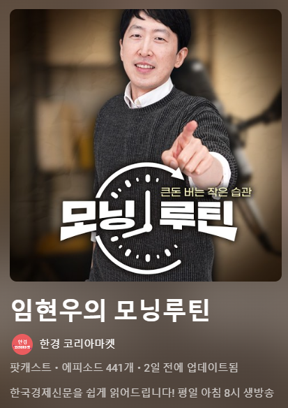나는 매일 아침 8시마다 한경 코리아 마켓 유튜브 채널에서 진행하는 '임현우 기자의 <모닝 루틴>'을 듣는다. (6개월 이상 듣고 쓰는 진심의 추천글입니다. 광고 아님 ^^;; ) 평일 8시마다 30분간 진행하는데 기자가 차분한 목소리로 조목조목 그날 한국경제 신문에 나온 주요 기사 내용을 훑어준다.